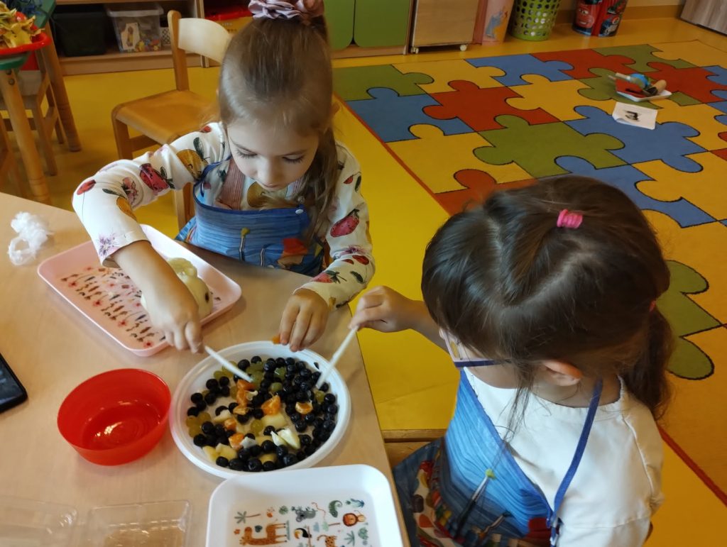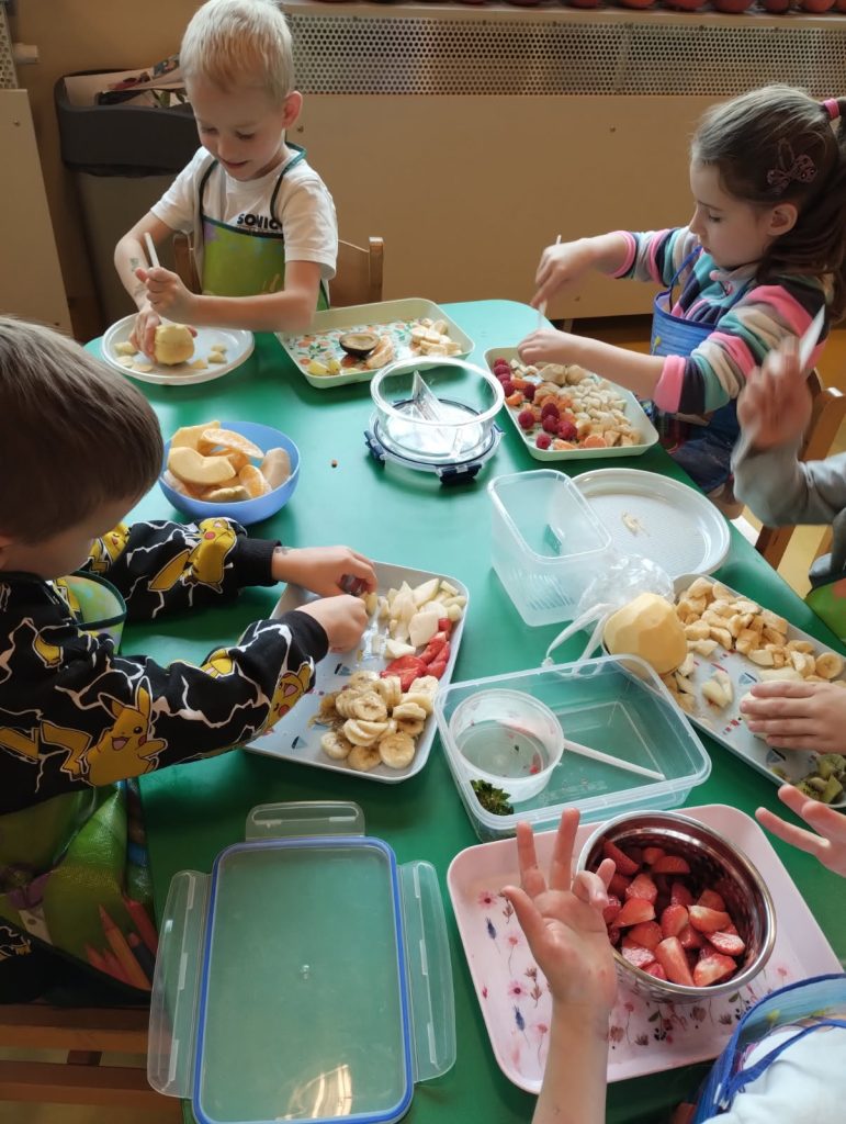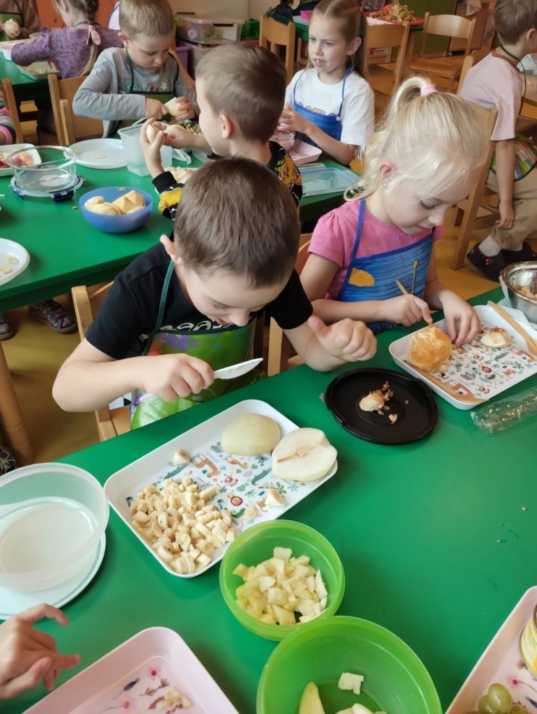 15 października w grupie V odbyły się zajęcia kulinarne, podczas których dzieci z wielkim zaangażowaniem przygotowywały pyszną i zdrową sałatkę owocową. Przedszkolaki przyniosły do sali różnorodne owoce – jabłka, banany, gruszki, mandarynki i wiele innych. Każdy z uczestników miał okazję samodzielnie pokroić owoce oraz wymieszać wszystkie składniki w dużej misce. Podczas zajęć dzieci rozmawiały o tym, dlaczego warto jeść owoce i jak wpływają one na nasze zdrowie. Nie zabrakło też rozmów o witaminach i zdrowym stylu życia. Na zakończenie wszyscy z apetytem skosztowali własnoręcznie przygotowanej sałatki, ciesząc się jej kolorowym wyglądem i pysznym smakiem. To była doskonała okazja do nauki poprzez zabawę, rozwijania samodzielności oraz kształtowania zdrowych nawyków żywieniowych.