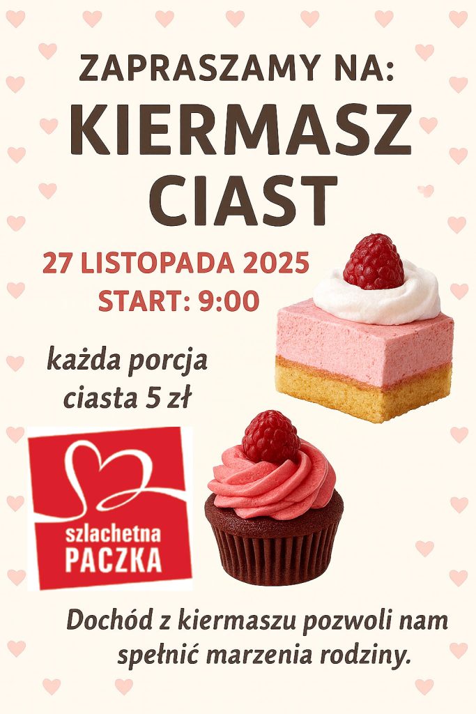 W związku ze zbiórką funduszy na zakup potrzebnych rzeczy organizujemy kiermasz ciast, który odbędzie się 27.11.2025 (czwartek) w holu szkoły.