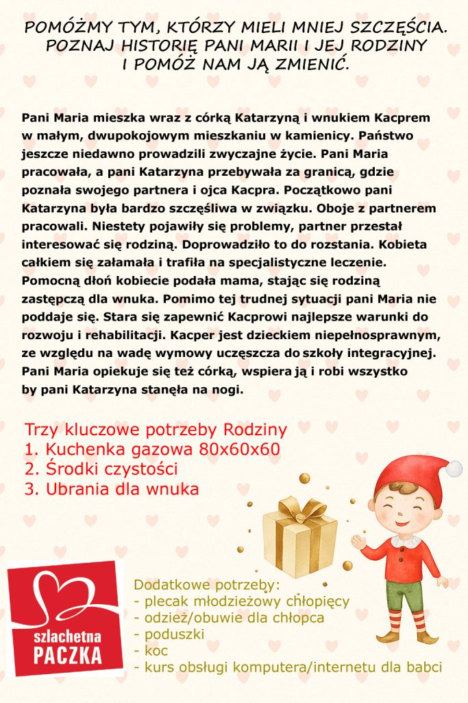 Pani Maria mieszka wraz z córką Katarzyną i wnukiem Kacprem w małym, dwupokojowym mieszkaniu w kamienicy. Państwo jeszcze niedawno prowadzili zwyczajne życie. Pani Maria pracowała, a Pani Katarzyna przebywała za granicą, gdzie poznała swojego partnera i ojca Kacpra. Początkowo pani Katarzyna była bardzo szczęśliwa w związku. Oboje z partnerem pracowali. Niestety pojawiły się problemy, partner przestał interesować się rodziną. Doprowadziło to do rozstania. Kobieta całkiem się załamała i trafiła na specjalistyczne leczenie. Pomocną dłoń kobiecie podała mama, stając się rodziną zastępczą dla wnuka. Pomimo tej trudnej sytuacji, pani Maria nie poddaje się. Stara się zapewnić Kacprowi najlepsze warunki do rozwoju i rehabilitacji. Kacper jest dzieckiem niepełnosprawnym, ze względu na wadę wymowy uczęszcza do szkoły integracyjnej. Pani Maria opiekuje się też córką, wspiera ją i robi wszystko by pani Katarzyna stanęła na nogi.