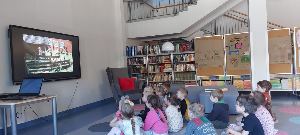 W ramach zajęć edukacyjnych wybrały się na spotkanie z panią Basią do biblioteki, gdzie poznały codzienność sprzed lat, oglądając i omawiając książkę oraz ekranizację znanej i lubianej lektury „Dzieci z Bullerbyn” autorstwa Astrid Lindgren. Mali czytelnicy z zainteresowaniem śledzili losy bohaterów, porównując ich życie na wsi sprzed lat z własną codziennością. Była to doskonała okazja, by porozmawiać o tym, jak wyglądało dzieciństwo bez komputerów, telefonów i telewizorów.