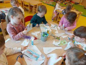 22 listopada przypada Dzień Kredki. To święto nietypowe, które ma na celu celebrowanie roli kredek w rozwoju dziecięcej wyobraźni, kreatywności i wyrażania emocji. Przedszkolaki z grupy II rozpoczęły to miłe święto od segregowania kredek, rozpoznawania ich kolorów oraz budowania z kredek na dywanie ciekawych obrazów. Tu sprawdziła się praca w zespołach. Niecodziennym wyzwaniem było także samodzielne wycinanie pokolorowanej kredki. Dzieciom bardzo podobało się cięci papieru nożyczkami. 😊