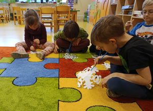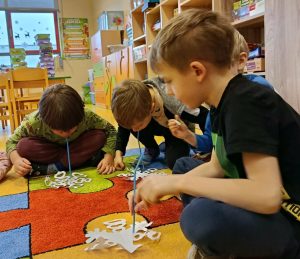 „W styczniu dzieci z grupy IV w ramach miejskiego programu profilaktyki logopedycznej usprawniały swoje buzie z wykorzystaniem przyborników i w oparciu o sezonowe pomoce. Zasysanie rurką papierowych śnieżynek nie jest zadaniem łatwym, trzeba się popisać precyzją i siłą mięśni ust. Nie każdemu udało się od razu podnieść swoją śnieżynkę, dla wielu zadanie wymagało licznych prób. Za to każdy chciał spróbować swoich sił i każdy w końcu osiągał swoje sukcesy. Rutynowe ćwiczenia z lusterkiem inspirowane bajką logopedyczną wzmacniają mięśnie buzi i języka, ze szczególnym naciskiem na jego pionizację, co ma docelowo ułatwić artykulację trudnych głosek”.