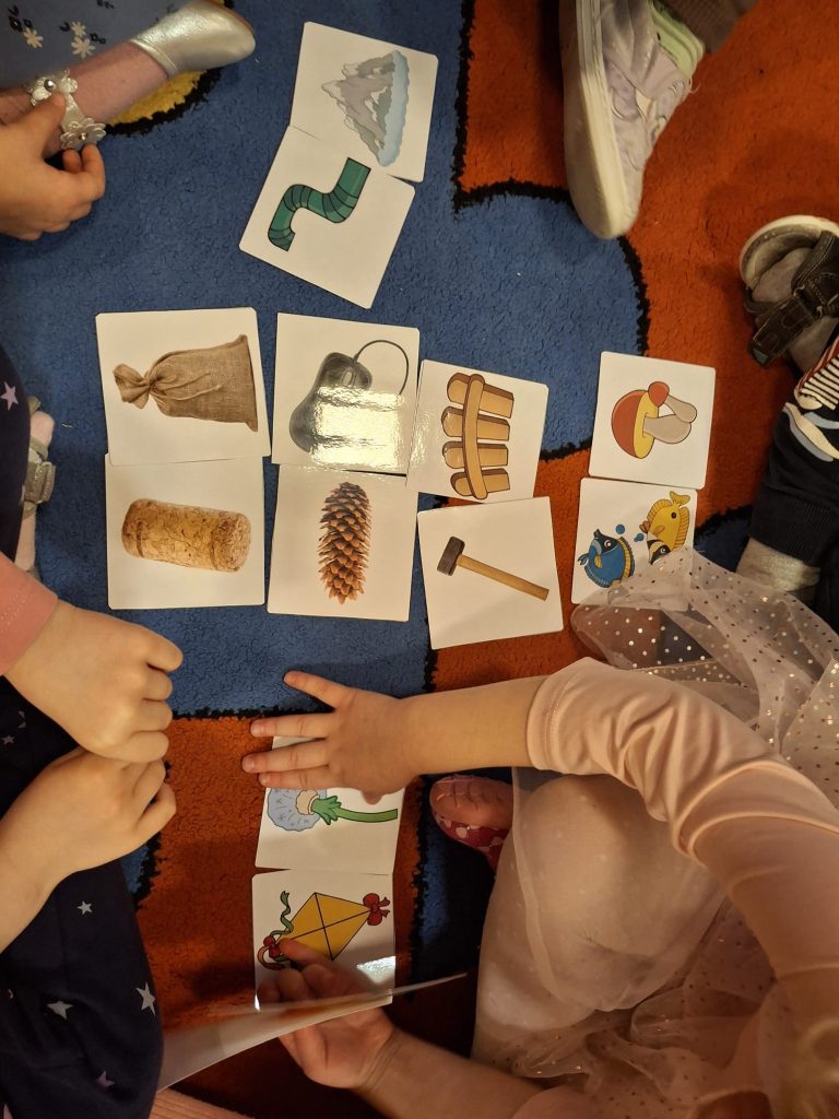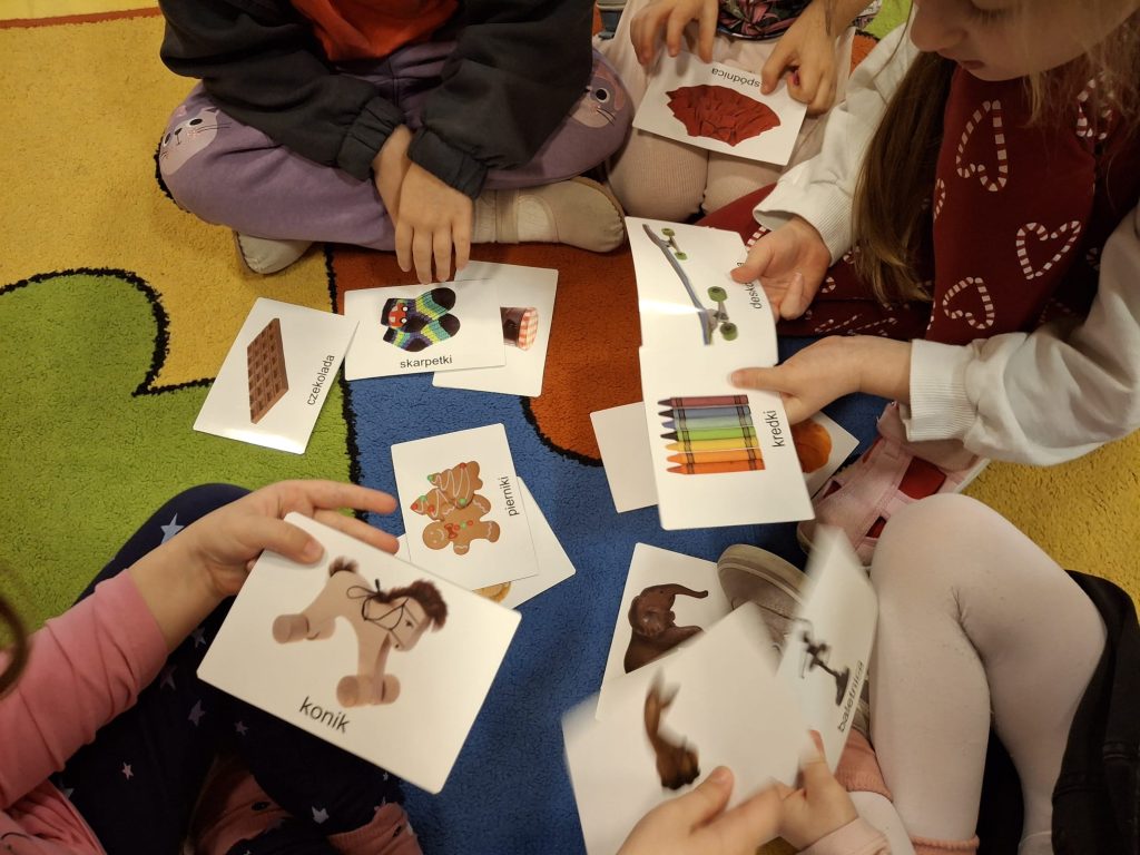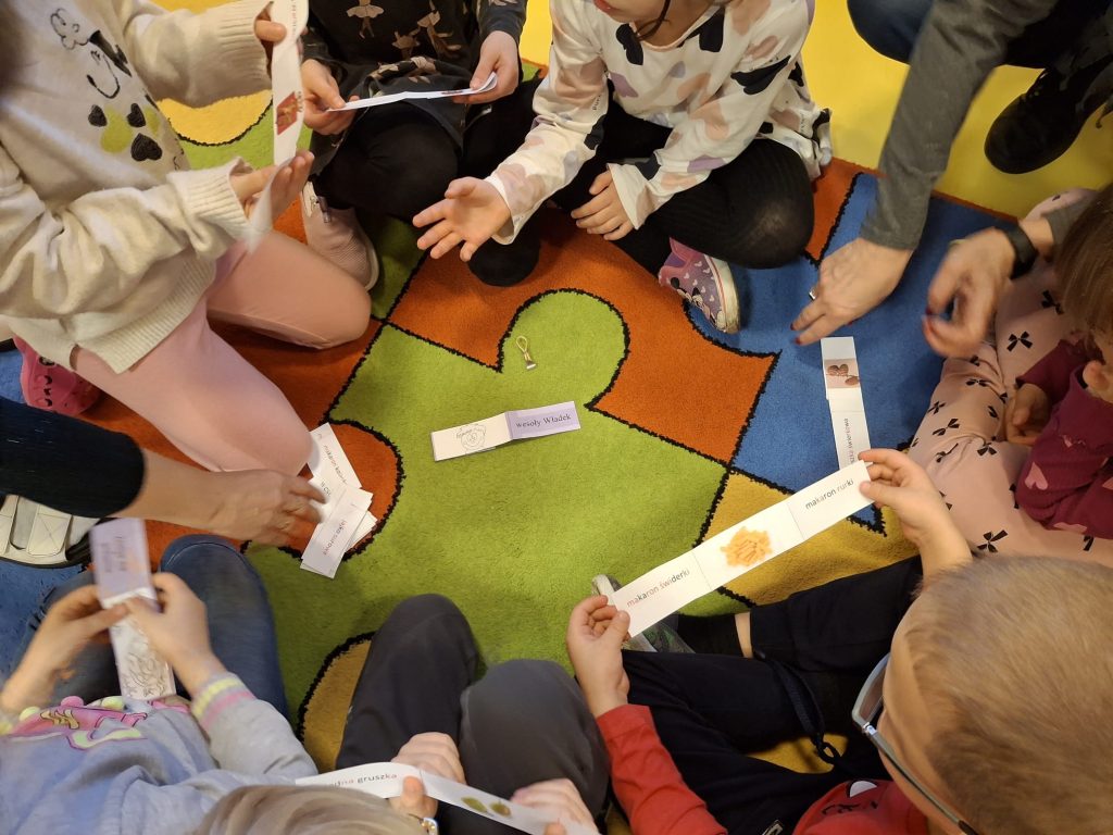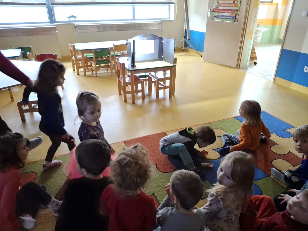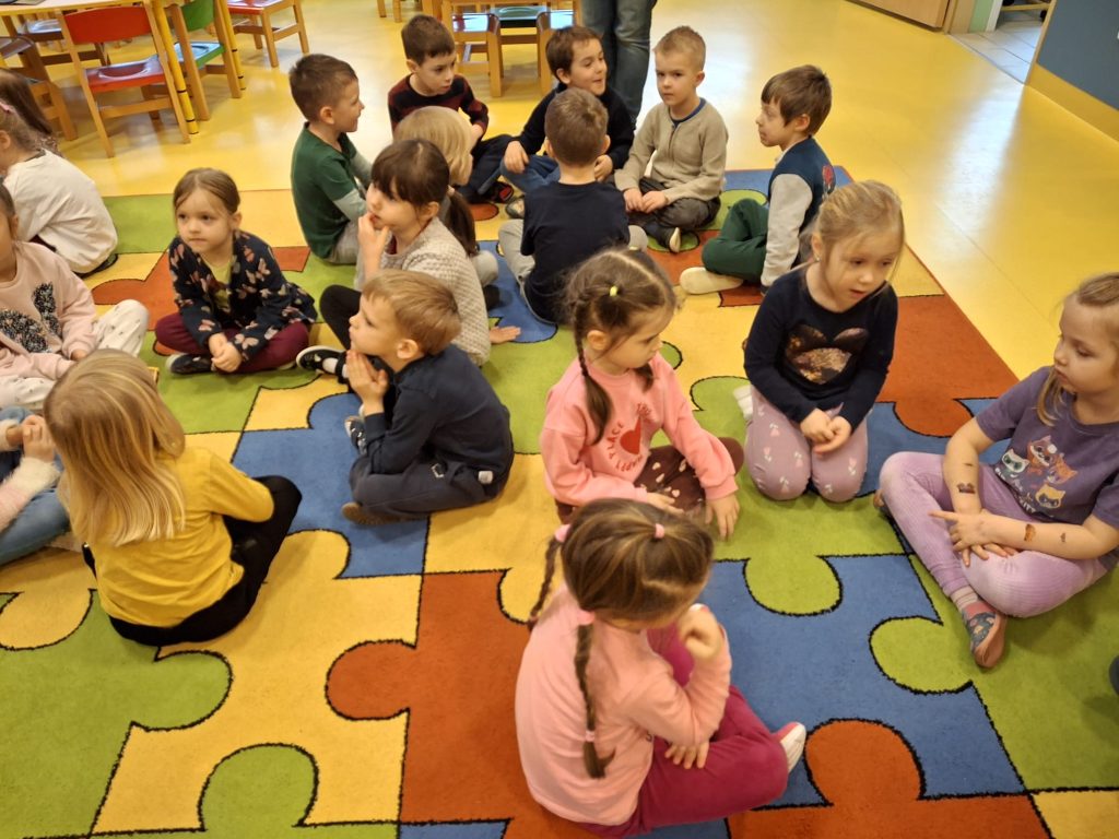 Grupa przedszkolaków siedzi w kręgu i bierze udział w zabawie słownej.