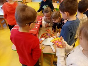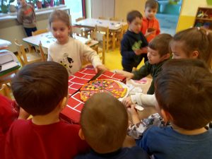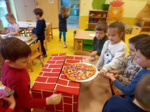 Pizza jest jedną z najpopularniejszych potraw na świecie. Uwielbiają ją zarówno dzieci, jak i dorośli, dlatego 9 lutego obchodziliśmy Międzynarodowy Dzień Pizzy. Podczas zajęć dzieci poznały krótką historię tego przysmaku, dowiedziały się, z jakiego kraju pochodzi oraz poznały składniki, które są niezbędne do jego przygotowania. Stworzyły też własny, kolorowy i smakowicie wyglądający kawałek pizzy, wykorzystując do tego plastelinę. Pomimo, że była ona wykonana z plasteliny, to rozbudzała wszystkie apetyty. Dzieci wypiekały ją umieszczoną na szufli w piecu wykonanym z kartonu.