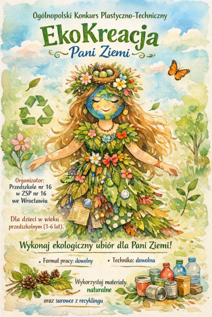 Serdecznie zapraszamy dzieci w wieku przedszkolnym (3–6 lat) do udziału w ogólnopolskim konkursie plastyczno-technicznym „EkoKreacja Pani Ziemi”, organizowanym przez Przedszkole nr 16 w Zespole Szkolno-Przedszkolnym nr 16 we Wrocławiu.