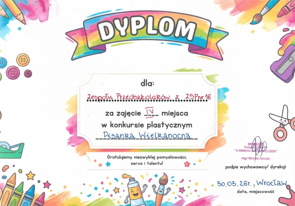 IV miejsce przedszkolaków ZSP16 w konkursie plastycznym PISANKA WIELKANOCNA