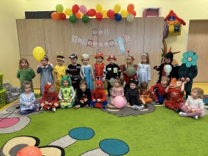 Przedszkolaki z grupy I wraz z resztą grup przedszkolnych wzięły udział w wesołej zabawie muzyczno-tanecznej, podczas której nie brakowało ulubionej muzyki, tańców oraz wspólnych animacji. Kolorowe stroje i przebrania sprawiły, że sala zamieniła się w prawdziwą krainę zabawy i fantazji.