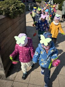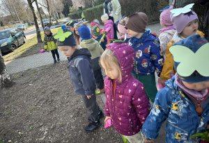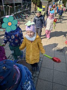 Tego dnia przedszkolaki wybrały się na spacer w okolicy przedszkola, aby wspólnie przywitać nową porę roku. Dzieci w rękach trzymały kolorowe, balonowe kwiaty oraz dzwoneczki, a ich czapki ozdabiały barwne, wiosenne motyle.
