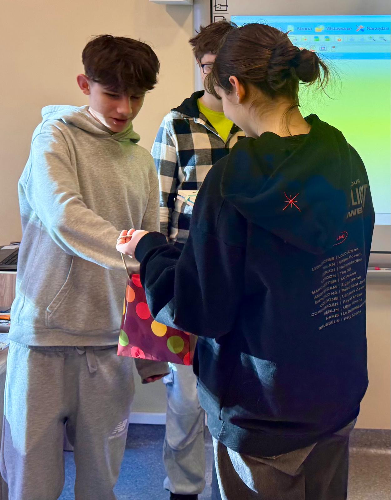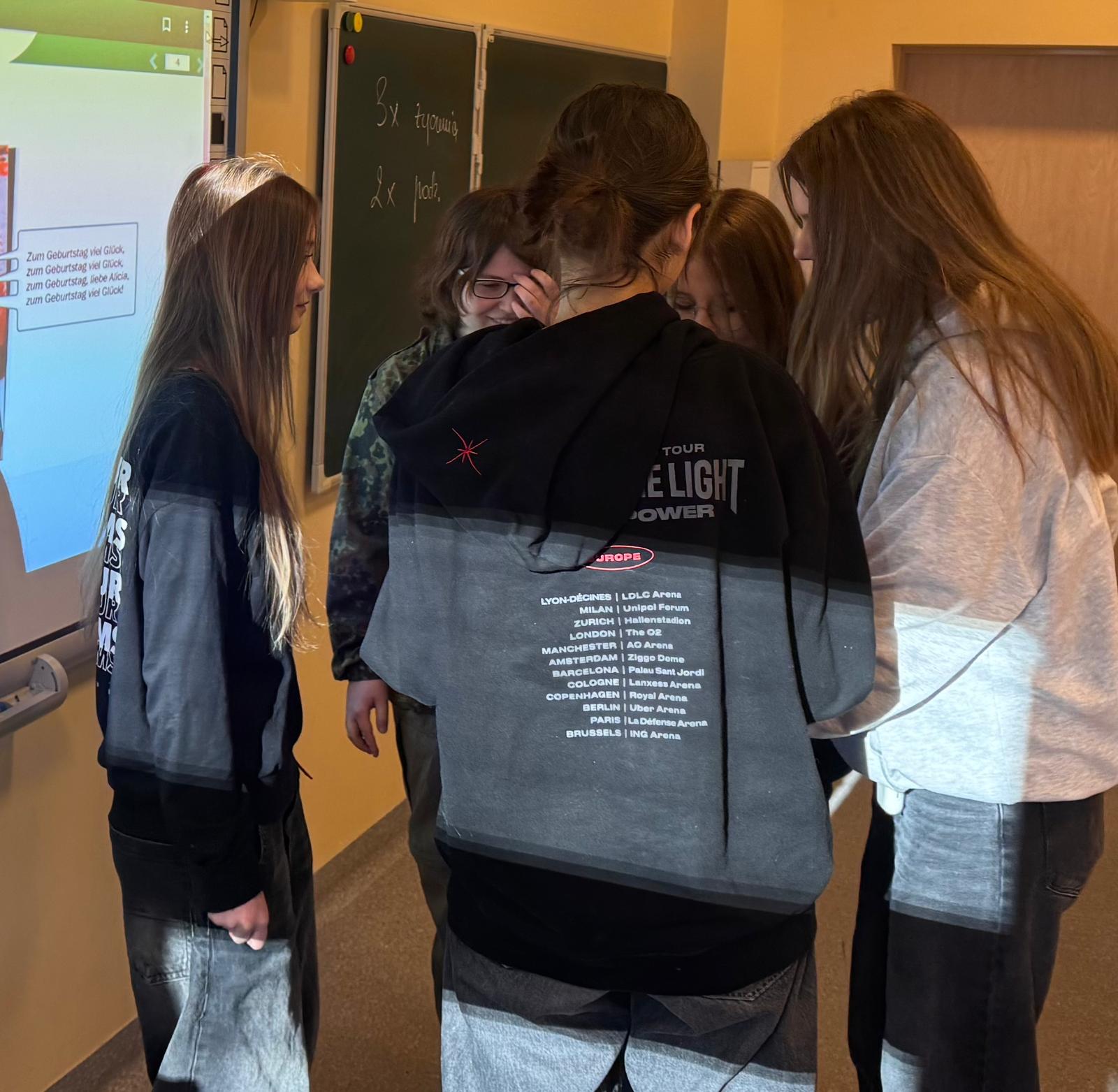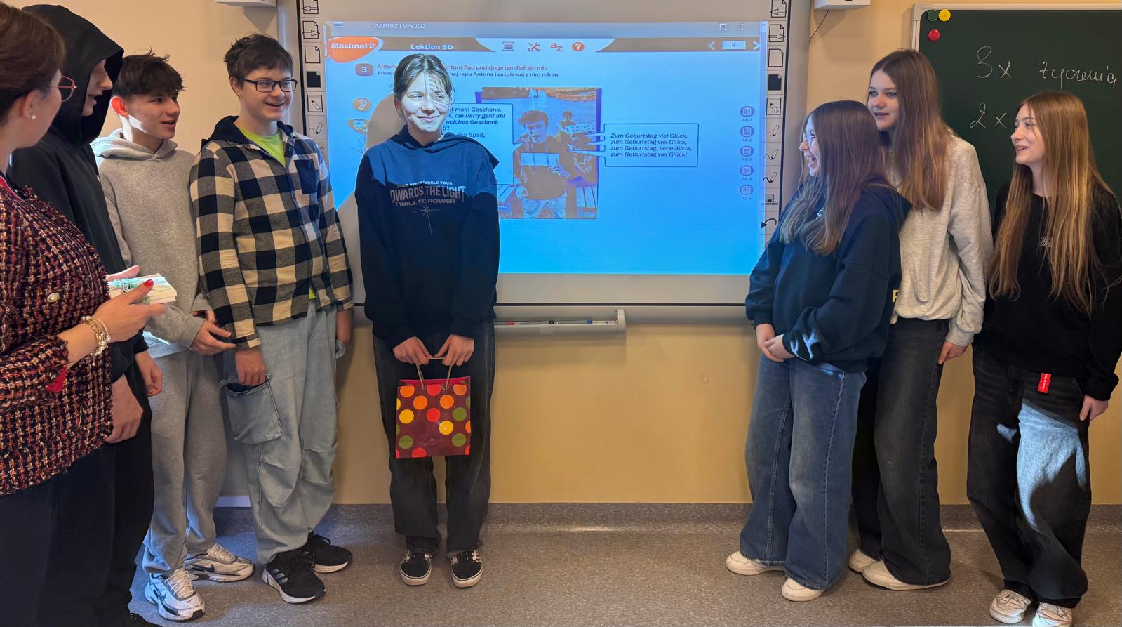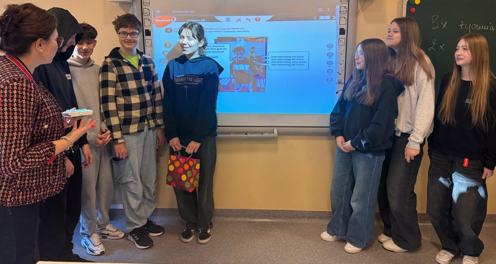 W nauce języka obcego ważne jest stosowanie poznanych słówek, zwrotów i wyrażeń w odpowiednich sytuacjach. Takich jak ta. Naszej jubilatce została odśpiewana piosenka urodzinowa, złożone życzenia oraz prezent. W zamian otrzymaliśmy podziękowania i poczęstunek. I to wszystko odbyło się w języku niemieckim. Dowiedzieliśmy się również o zwyczajach urodzinowych w krajach niemieckojęzycznych. Alles Gute zum Geburtstag!