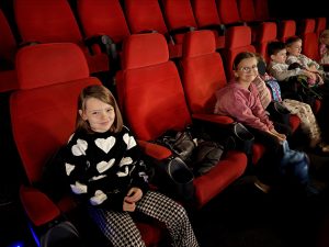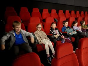 Uczniowie w trakcie seansu w kinie.